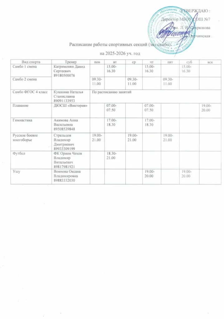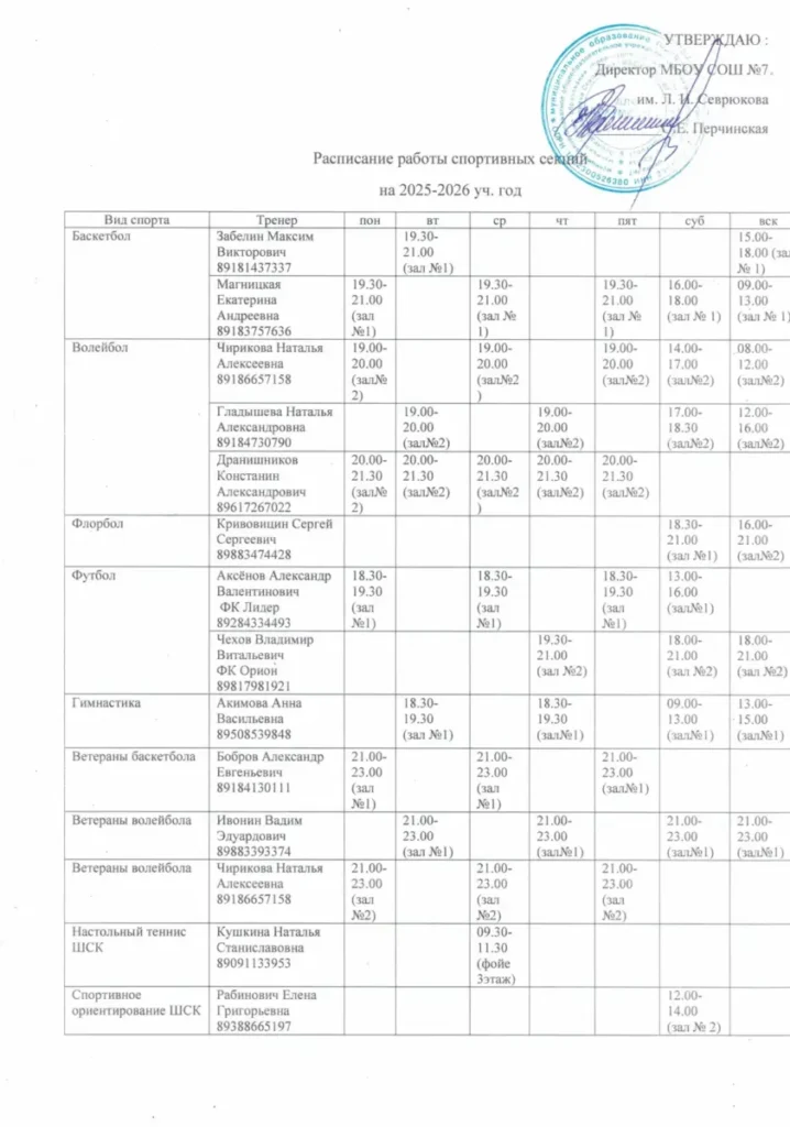 Расписание работы спортивных секций на 2025/2026 учебный год