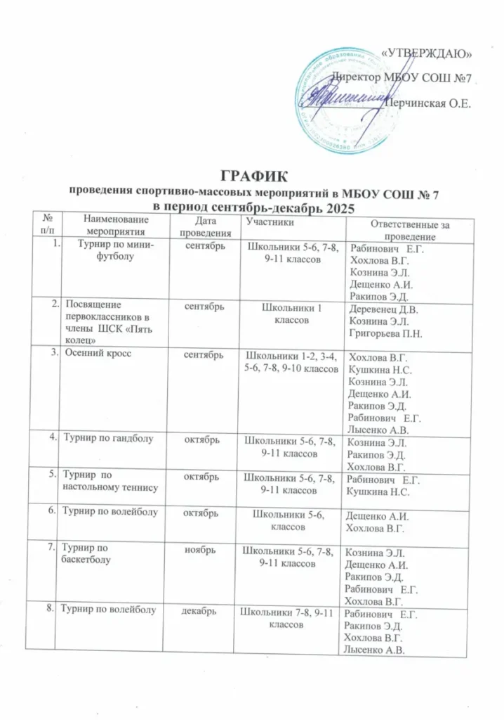 проведения спортивно-массовых мероприятий в МБОУ СОШ №7 в период сентябрь-декабрь 2025